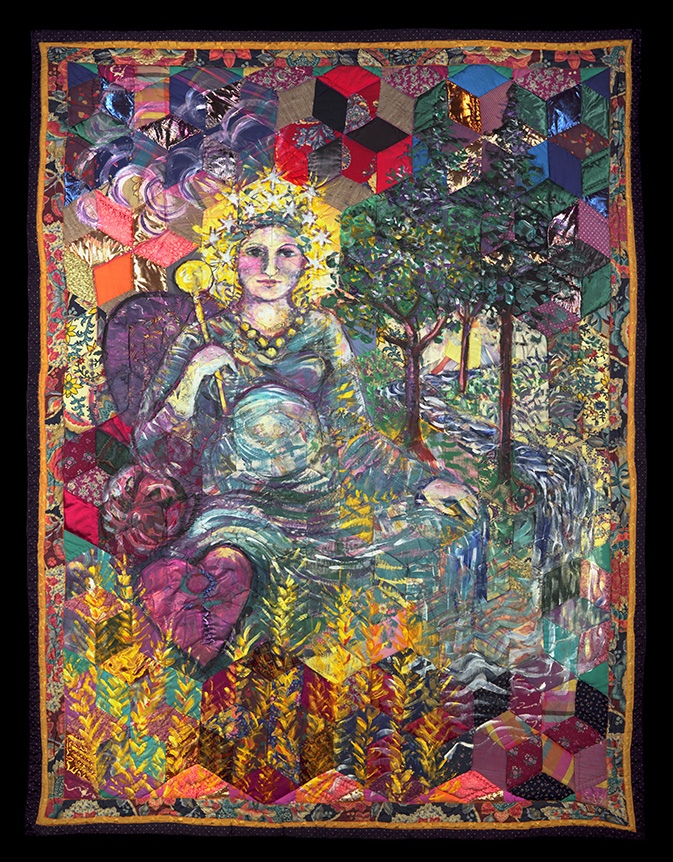 What Sussan saw that morning in Sudasi Gardner’s side room was arguably the crowning achievement of Sudasi’s prolific artistic career thus far – her collection of 20 quilts inspired by the Tarot deck. Sudasi produced these large (3′ x 4′), intricately quilted and painted pieces, each representing a major arcana Tarot card, over a six-year period. Because of the collection’s size (and Sudasi’s wish that the quilts should stay together), these quilts have rarely been displayed to the public. Sussan immediately knew this was something she wanted to remedy.